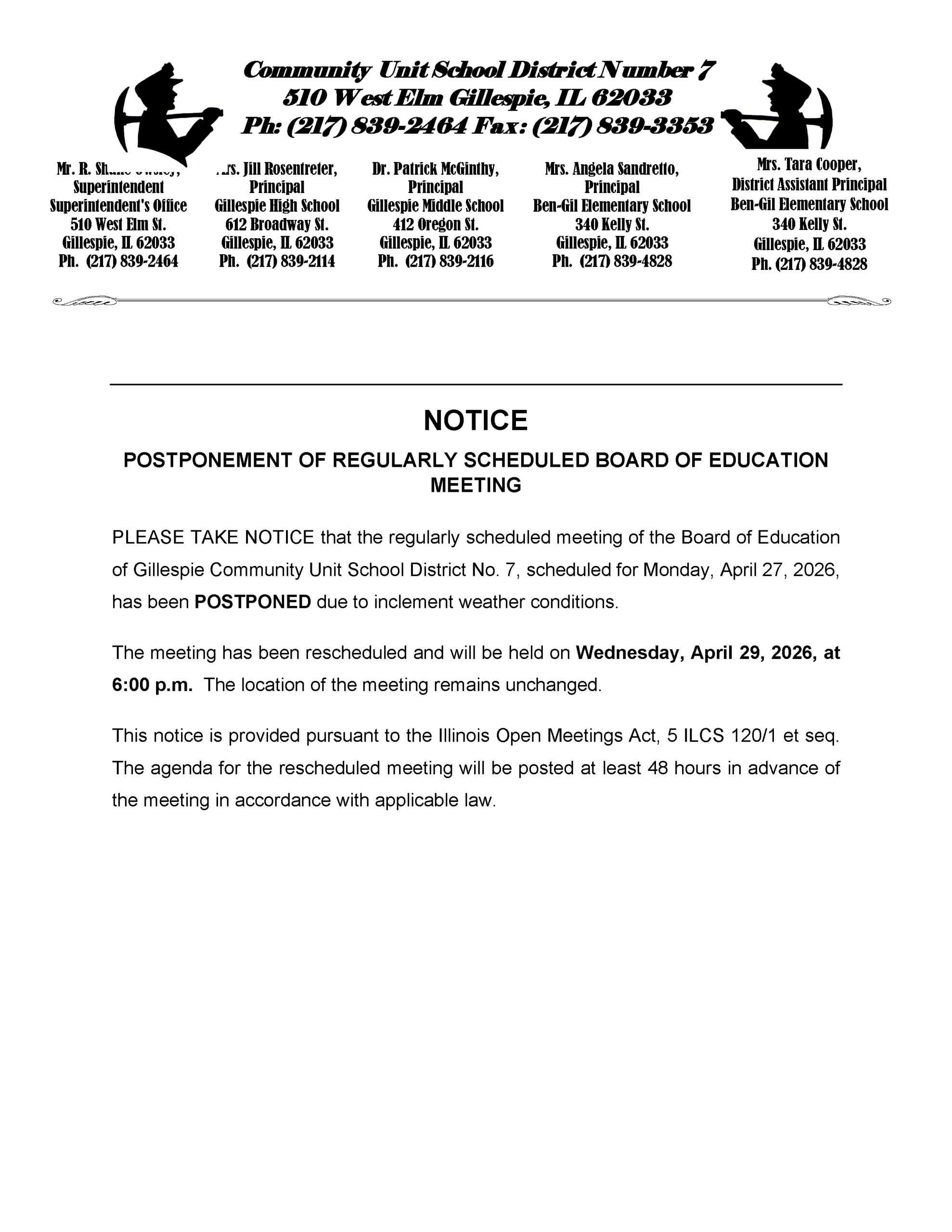 NOTICE POSTPONEMENT OF REGULARLY SCHEDULED BOARD OF EDUCATION MEETING April 27, 2026 Mark Carpani [featured_image] Download Version Download File Size 156.43 KB File Count 1 Create Date April 27, 2026 Last Updated April 27, 2026 NOTICE POSTPONEMENT OF REGULARLY SCHEDULED BOARD OF EDUCATION MEETING Attached Files 1 file Board Meeting Postponement.pdf156.43 KBDownload